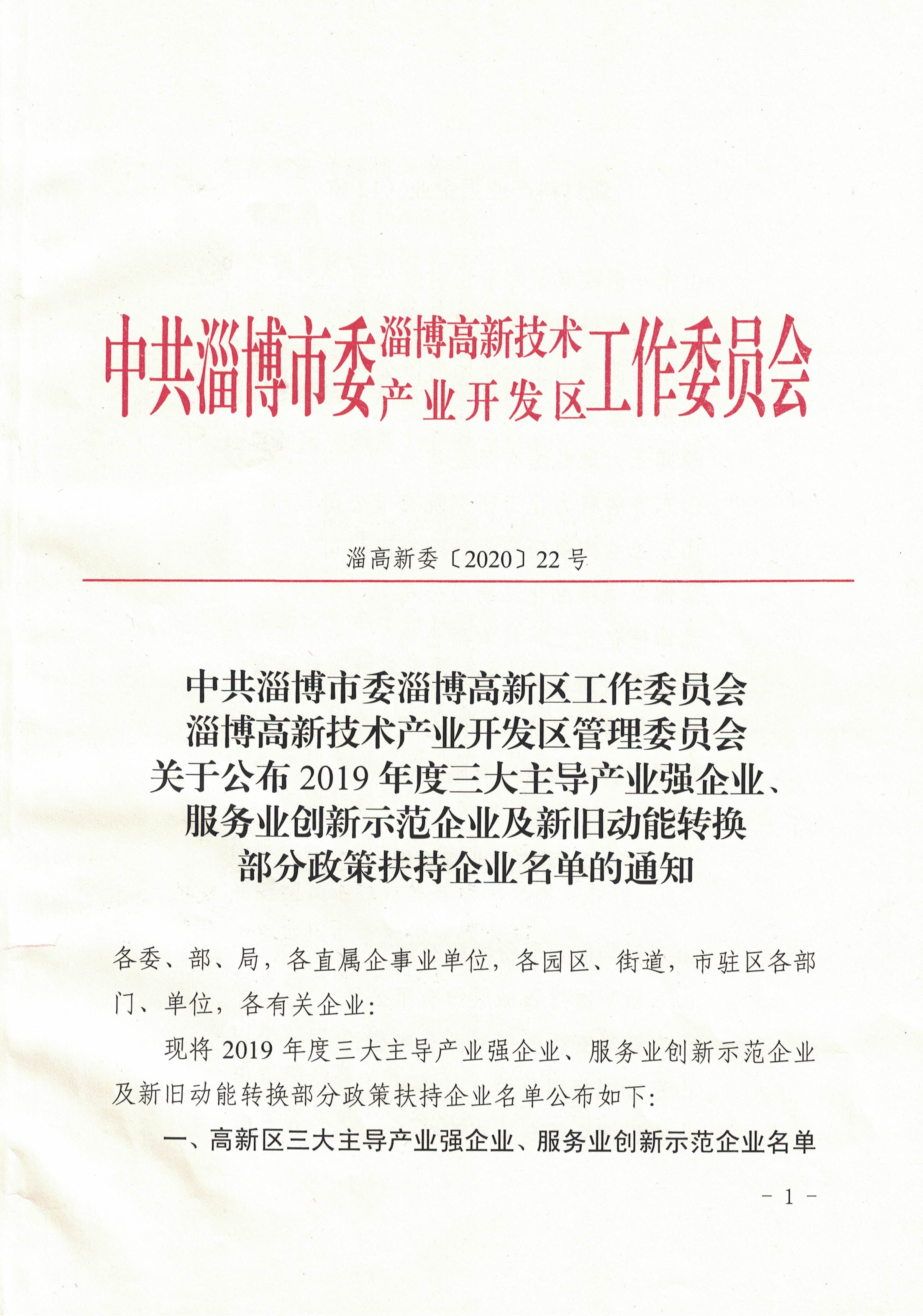 2020年4月28日,中共淄博市委淄博高新區(qū)工作委員會、淄博高新技術(shù)產(chǎn)業(yè)開發(fā)區(qū)管理委員會下發(fā)《關(guān)于公布2019年度三大主導(dǎo)產(chǎn)業(yè)強(qiáng)企業(yè)、服務(wù)業(yè)創(chuàng)新示范企業(yè)及新舊動(dòng)能轉(zhuǎn)換部分政策扶持企業(yè)名單的通知》(淄高新委〔2020〕22號),山東齊信招標(biāo)有限公司(簡稱齊信)等23家企業(yè)為2019年服務(wù)業(yè)創(chuàng)新示范企業(yè)。