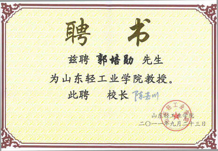 九月二十三日,我公司董事長(zhǎng)郭培勛先生(中)受聘山東輕工業(yè)學(xué)院教授聘書頒發(fā)儀式在學(xué)院會(huì)議廳舉行,山東輕工業(yè)學(xué)院校長(zhǎng)陳嘉川(左)親自為郭培勛先生頒發(fā)聘書,院黨委書記徐同文(右)出席了聘書頒發(fā)儀式。
